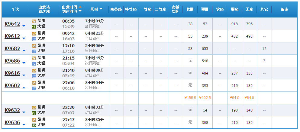 提醒:云南目前还没有开通动车或高铁(据内部人士透漏,动车要等到2017年),目前只有老旧的“绿皮车”(其实是红皮),这些破车即慢且吵,非常的不爽。不过从昆明有一班旅游专列,每天中午12:10分自昆明出发-经大理至丽江,此专列为上下双层卧铺车(无硬座),比那些“绿皮车”先进的多、快的多,且卧铺票价与“绿皮车”一样~~~~如果时间安排允许的话,一定要选择这一辆。这也是事后从别人口中得知的信息,十分羡慕。