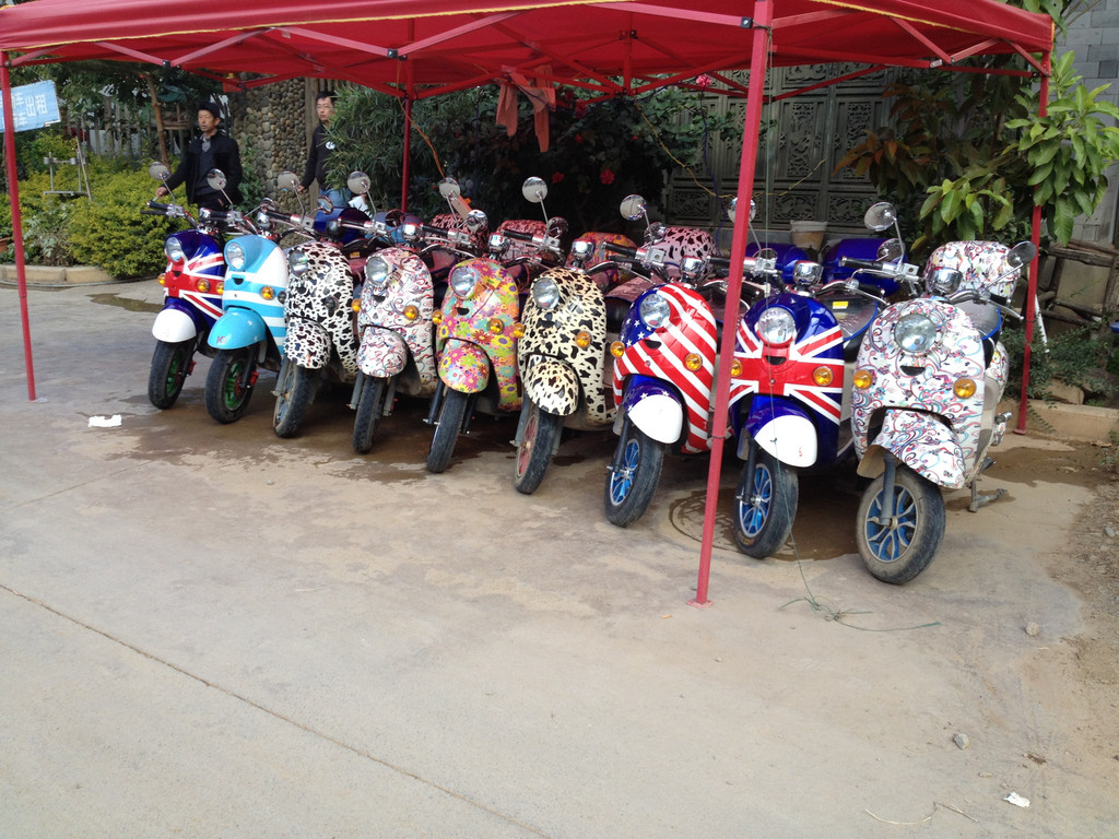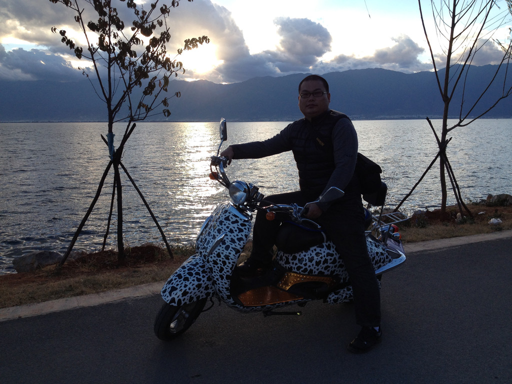 小海要陪姑娘们看日落,骑行的旅程就剩我跟老钟了~~~我们选了两辆全新的大号电动摩托车,一次充电可跑70公里。。小的电瓶车也就40公里吧。。要价60.,砍价到50。。。。 走起。。。