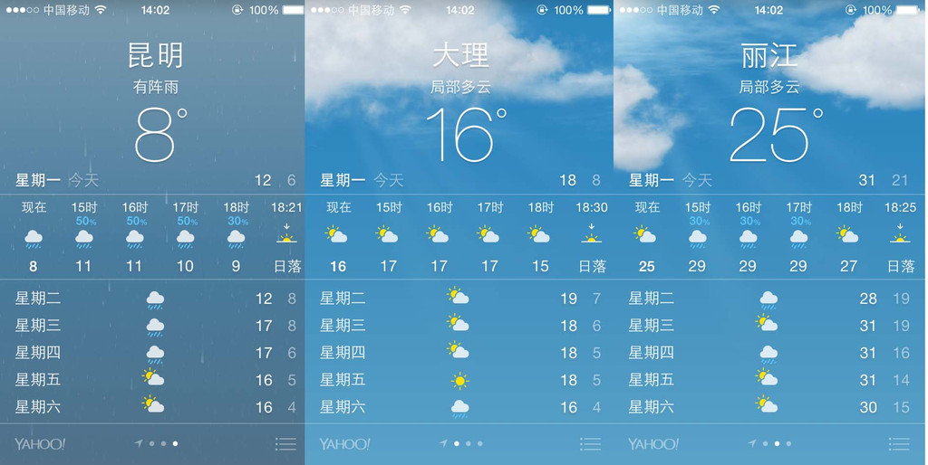 从这写图片里可以看出,昆明、大理与丽江的温度差有10几度,且昆明在天天下雨~~~正是这苦逼的天气预报让我把冬天和夏天的衣服都带上了。事后证明这是个多么苦逼的决定,这些衣服都成了累赘,根本用不上。因为云南各地的温度都差不多少,且艳阳高照。。。