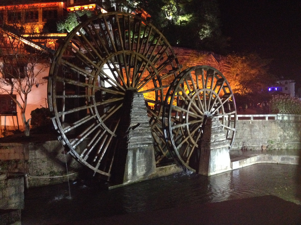 D4,上午在酒店等人、晒太阳、看看书,下午拼车去丽江,晚上游丽江古镇,大水车、酒吧一条街,宿丽江古镇。
