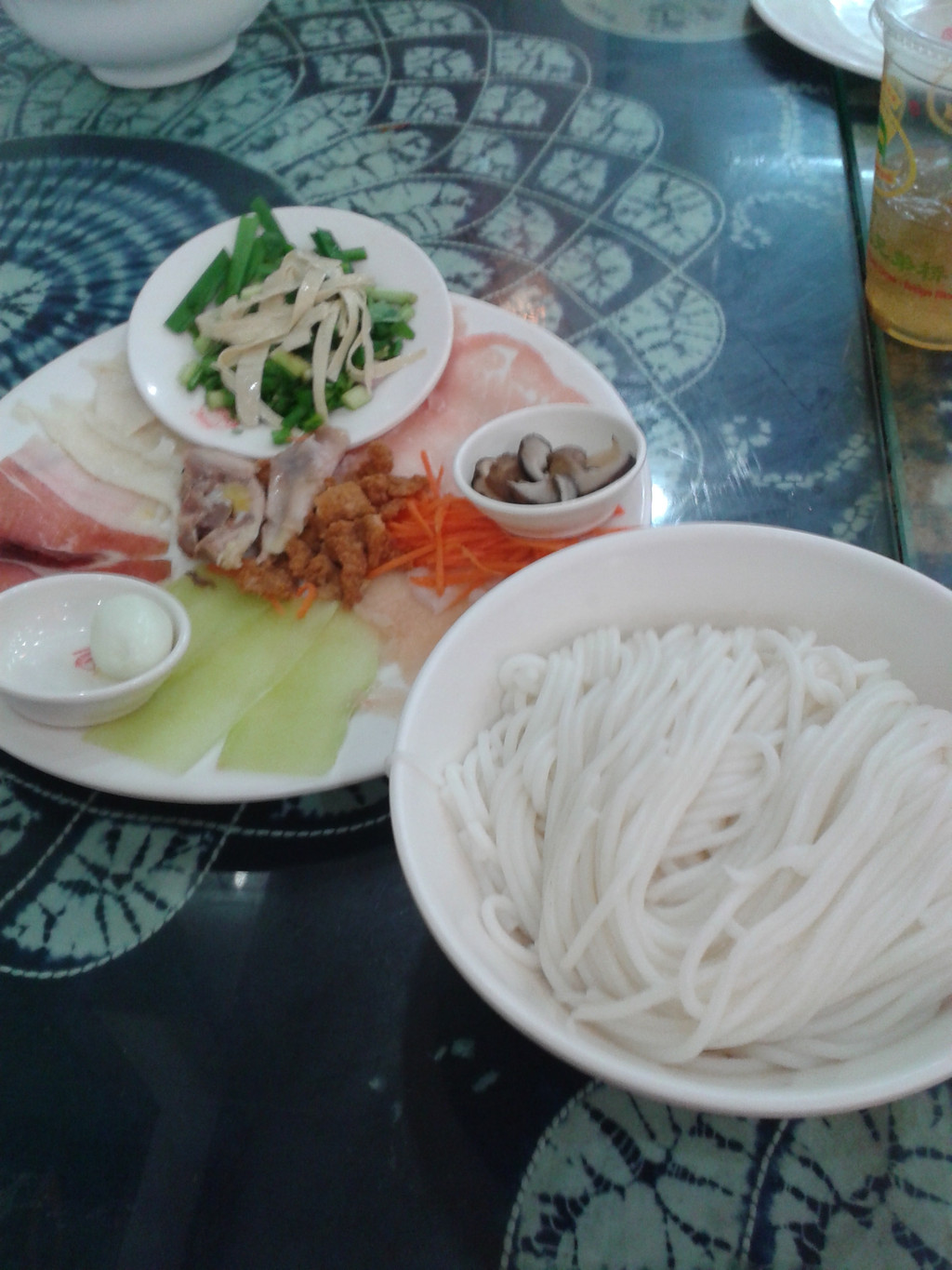 在步行街的”桥香缘“吃的米线,说实在的,第一次吃米线,还闹了一个大笑话··~去的这家店是一家老店,生意很火爆,服务员有点忙不过来。坐下点了一份当地的特色米线,叫啥”状元三鲜米线“,服务员给上了一盘菜(包括肉片、青菜、鹌鹑蛋等等)和一碗干的米线就撤了。等等,米线是不是应该有汤啊~~ ??? 还是这就是”特色“??看服务员也没有搭理的我的意思,饥肠辘辘,那就吃吧,拿米线当炸酱面给吃了,吃到一半的时候服务员才把热汤送上来~~服务员看到我这个吃像,感觉十分的尴尬,愣了足有5秒钟~~· 头一回进城,没见过市面,不好意思啊!! 服务员感觉心有歉意,又免费给上了一碗米线。让把作料和米线倒入碗中,这时才体会到了米线的真正味道~~~
