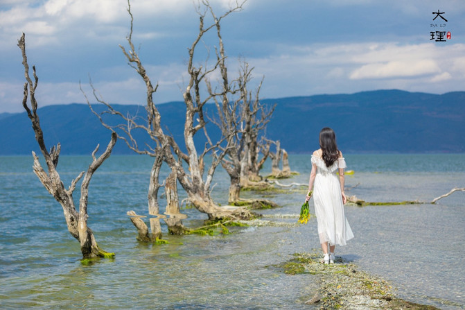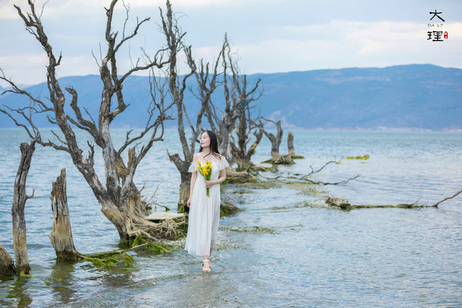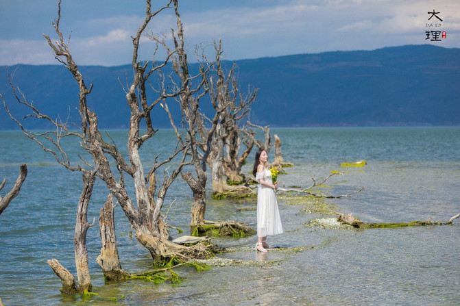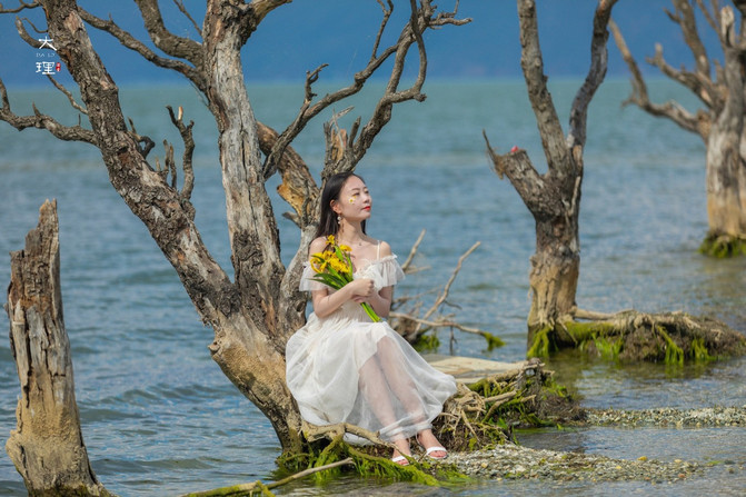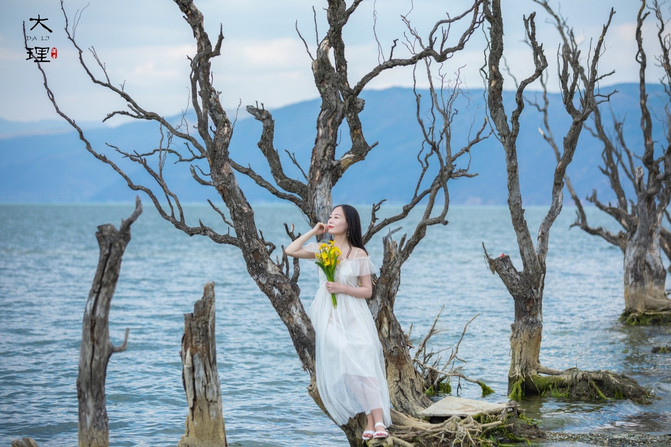 跟着拍婚纱照的摄影师走,果然看到了一处海边枯树,超级美。不过等他们拍完等了很久,洱海边风比较大,还是很冷的。