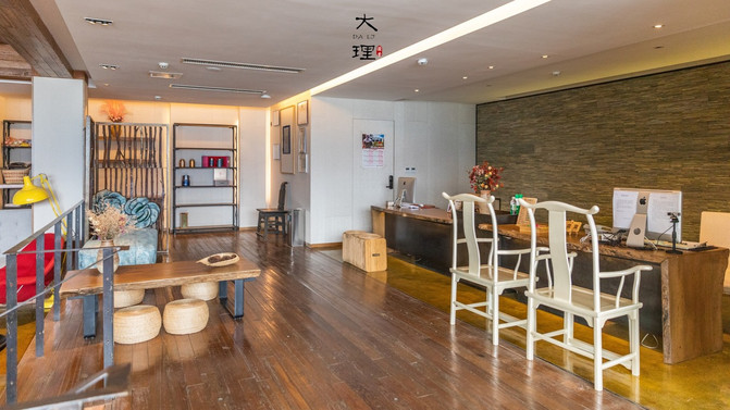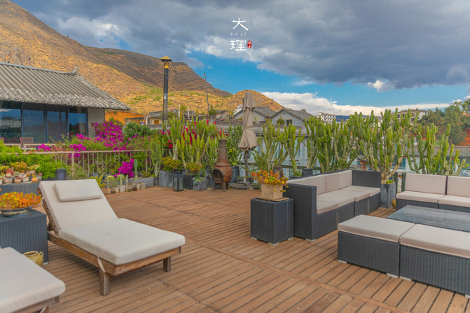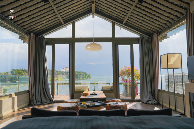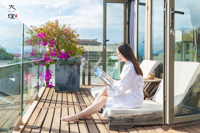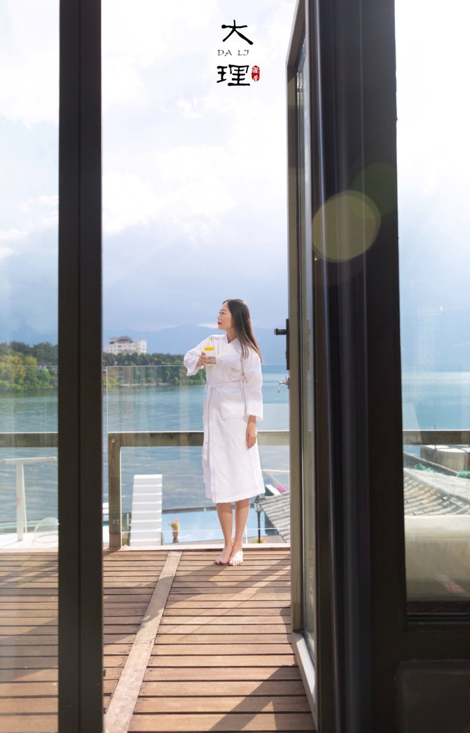 大堂还有一面巨大的落地窗,面朝洱海,采光通透,落地窗外有一个大露台,可以远眺洱海,视野相当好,坐下就不愿意走了。