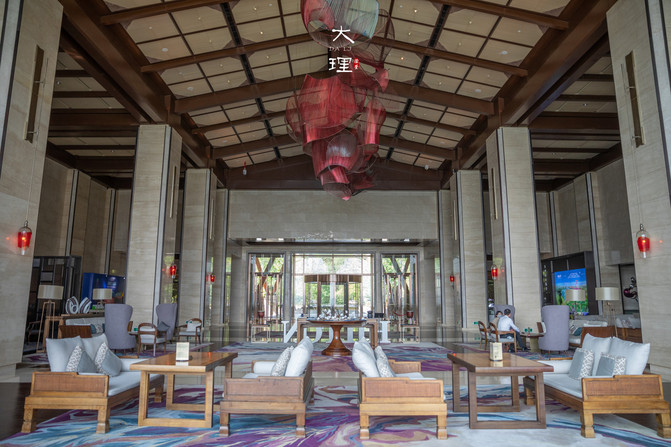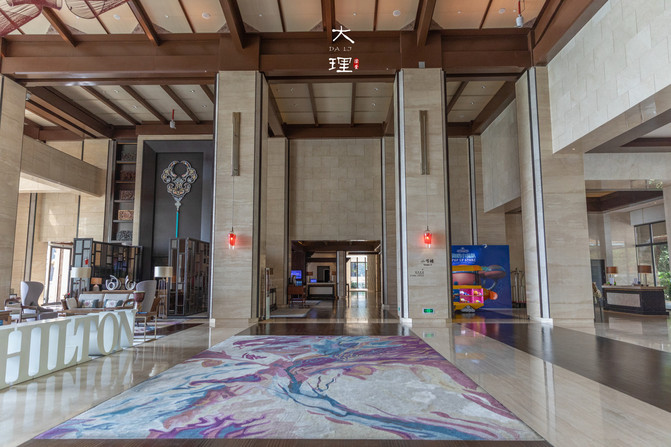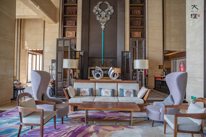 酒店整体呈扇形分布,大堂位于中庭,很有白族民族特色。设计灵感取自于祥云的图腾装饰贯穿整个大堂,左右两侧各一个壁炉,营造出白族人家热情好客的氛围。