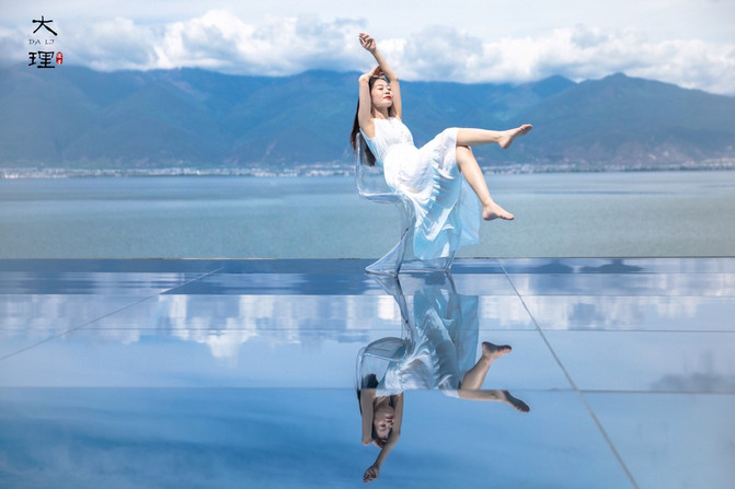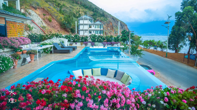 除了顶楼的天空之镜,二楼的空中花园同样令人惊喜。无数的鲜花,下沉式的休息区,无边泳池与洱海连为一体,根本不用去景点,这里就能呆上一整天。