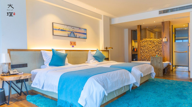 我们的客房就在二楼的空中花园旁,是间温馨的双床房,配有高端的床品,还有可以放音乐的蓝牙音响。推门有个露台,正对洱海,可以看到绝美的日落与晚霞。