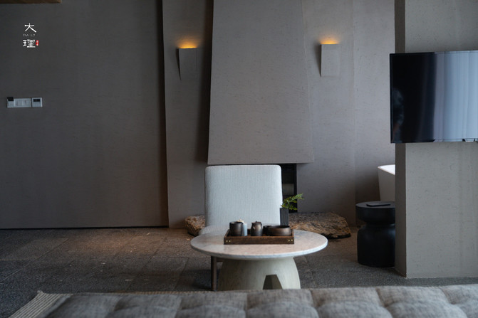 整个客房色调以灰黑色为主,从花瓶摆设到喝茶的茶具都颇具禅意。清风徐来,闭目凝思,任思绪回到过去,忘却一切尘嚣,才能真正回归本真的生活。
