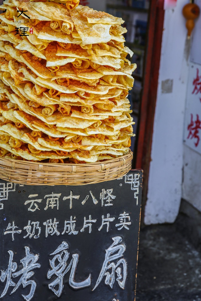 烤乳扇是 大理 独一无二的特色小吃,用牛奶做成片装晾干,颜色微黄透亮、乳香浓郁。 大理 古城的街道上就可以买到,几块钱一片,它也号称是 云南 十八怪。