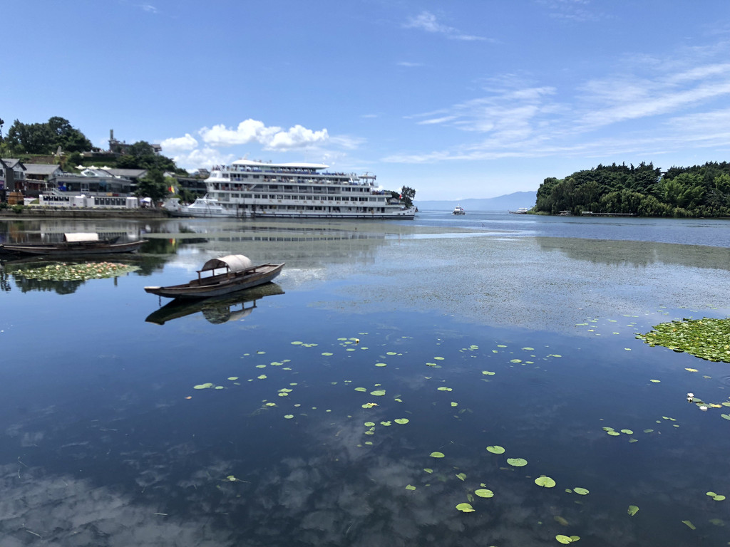 自驾洱海游出发,先到喜洲古镇(停车费10元,景区里的景点都需要单独收费,果断放弃),直接导航的双廊古镇(不走高速,走沿海线)。延线太美了,绿油油的稻田、粉嘟嘟的荷花、白灿灿的云朵。大朵大朵的云飘荡在蔚蓝的天空,各种形态都有:棉花糖、心、松茸、梯子、小狗、凤凰,只要你想,它可以跟着你的想象变化成你想要的样子。双廊古镇很美,这里有很多网红打卡点,但拍照要收费,好多漂亮的小姐姐排队。双廊古镇景区里边有观光车,如果走累了,可以乘车(单次10元/次)。我们在景区内一直玩到下午13:30左右,出景区开车环洱海(东环线)。太阳太大了,晒啊,隔着玻璃都感觉快被太阳烤熟了,还有人敞着车篷跑,真替他们的皮肤捏了一把汗。刚开始我们还是走走停停,偶尔跑下车子到海边拍照。后来实在太热了,着实不敢下车。佩服这一路来看到的拍婚纱照的情侣,一定痛并幸福着。我们商量着以后有机会,找个纪念日我们也要尝试一下旅拍,美好!