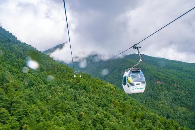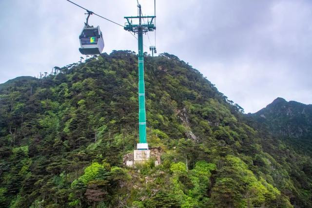 坐在轿厢里,透过玻璃发现满山的林海被雨水冲刷过后绿得发亮,离散的雾气在气流的推动下四处漂浮。