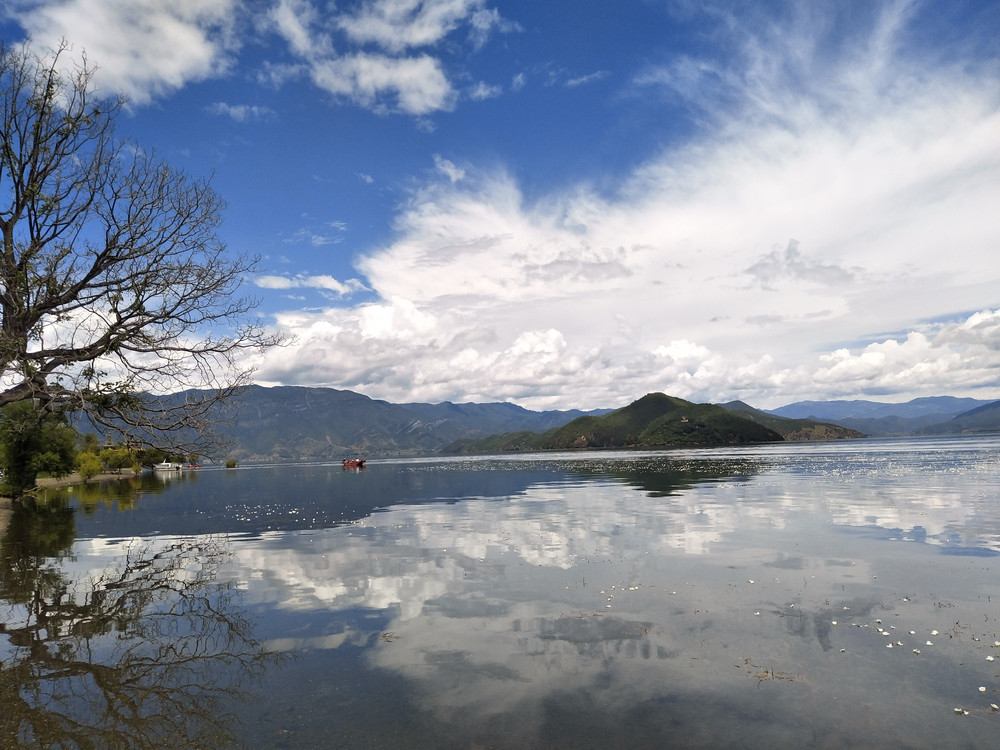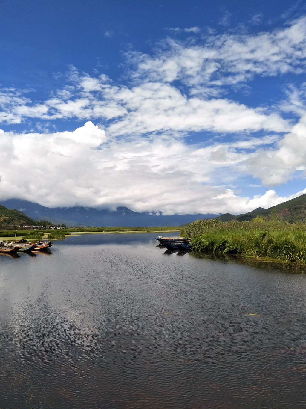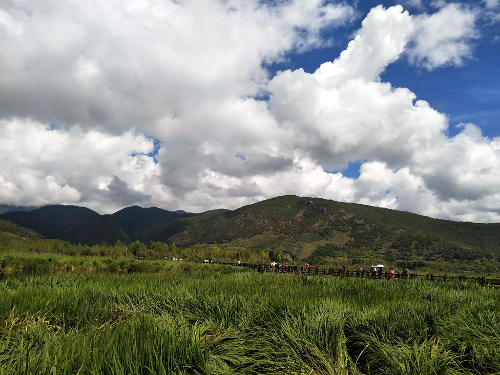 等我们到达草海走婚桥,蓝天白云又出来了,如果早点是这样的晴天,也许就可以看到开满湖面的花了