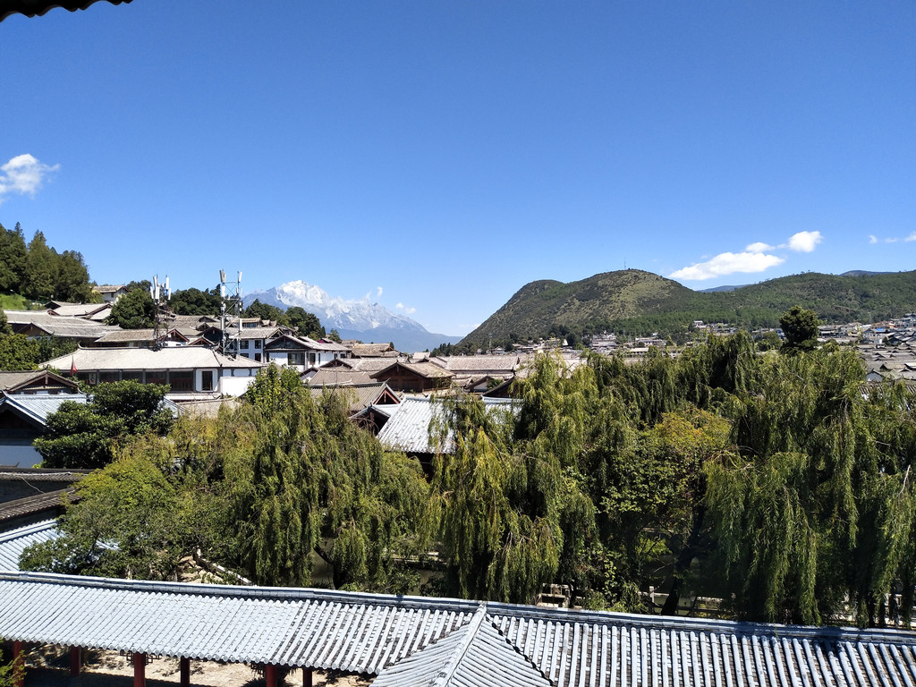 站在好像是万卷楼的楼上,可以看到远处的玉龙雪山。