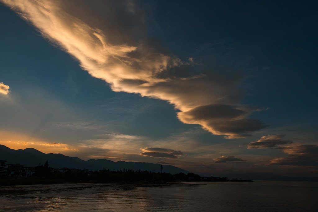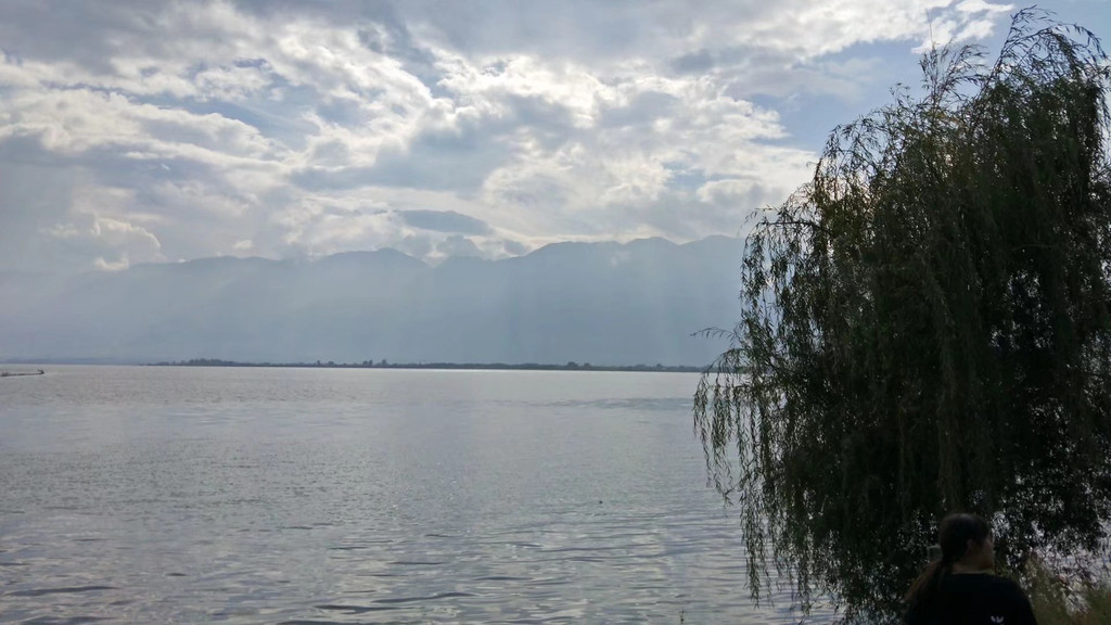 差不多下午3-4点的时候到海东,从海东看洱海超级好看!对面的苍山,山顶云雾缭绕,十分仙气。慵懒的阳光,被云层撕成一缕一缕轻柔的纱幔,悬挂在洱海之上。风也不忍心再折腾这脆弱的纱幔,变得很温柔,湖面上就像是撒了一把碎金,波光粼粼的。傍晚的时候,暮日熔金,云层像是被镀了一层金,美不胜收。