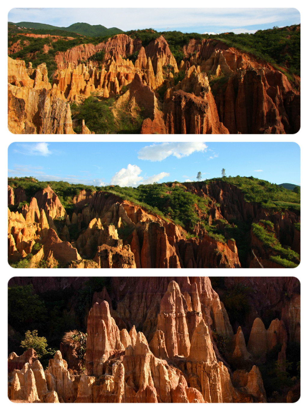 粗看土林,一个个土峰似树、似塔、似笋、似幔,也象待发的航天火箭;细看土林,高低错落,纵横相连;高山流水、人物头像、飞禽走兽……每一个土峰姿态万千,栩栩如生,给人以奇特的感觉和想象。