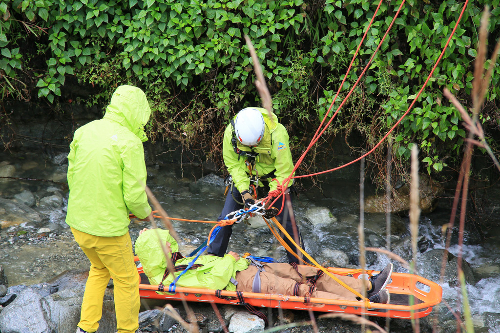 下午细雨绵绵,学员们在溪边观摩学习绳索垂直和横渡救援等内容。