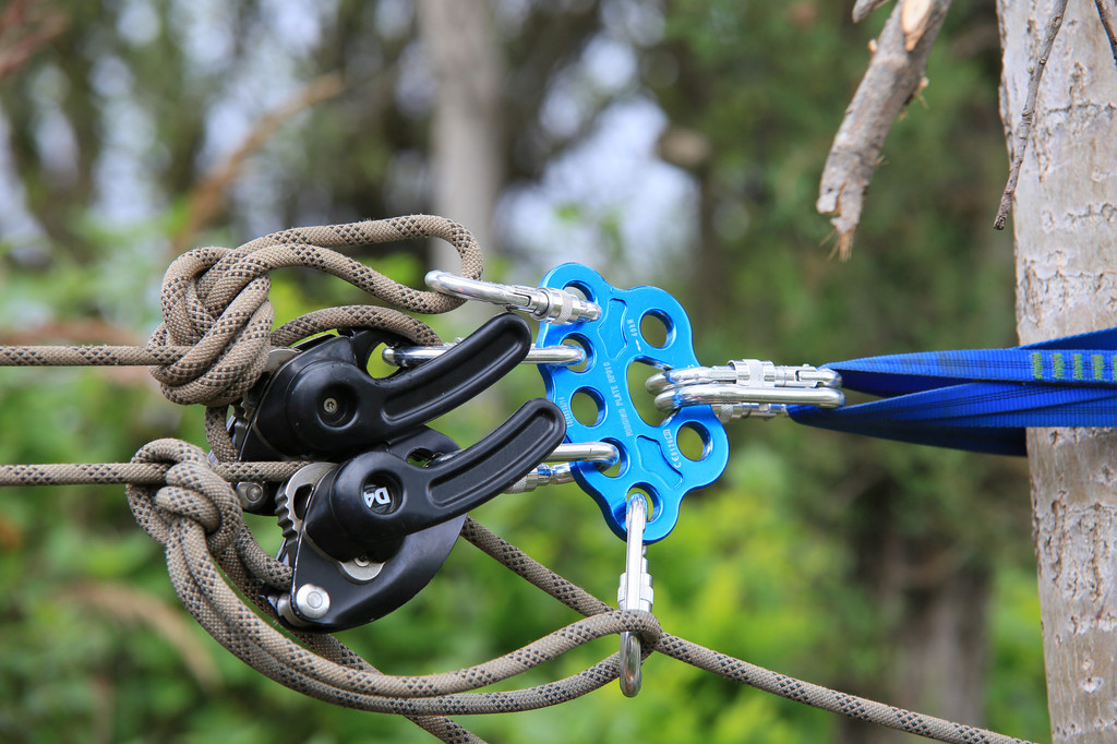 其次是横渡救援现场实际演练。由老师系统地介绍山地救援,绳索锚点选择、横索搭建、担架摆渡等救援知识。救援小组人员构成,由1位总指挥,1位担架手和4位操作手等组成。