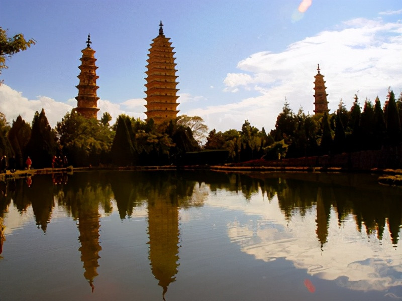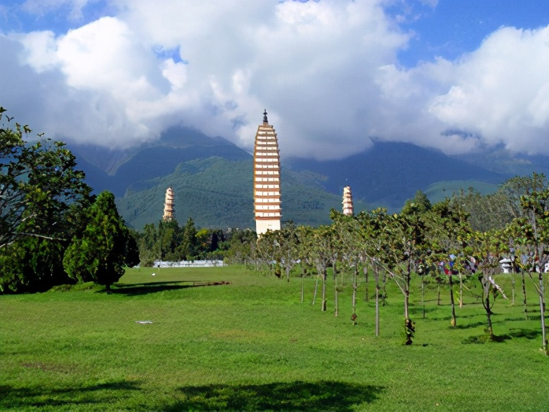 大理三塔,位于大理城北约一公里处。雪峦万仞、镂银洒翠的点苍山峙其后,波涛万顷、横练蓄黛的洱海嵌于前。三塔鼎峙,撑天拄地;玉柱标空,雄浑壮丽,为苍洱间的胜景之一。