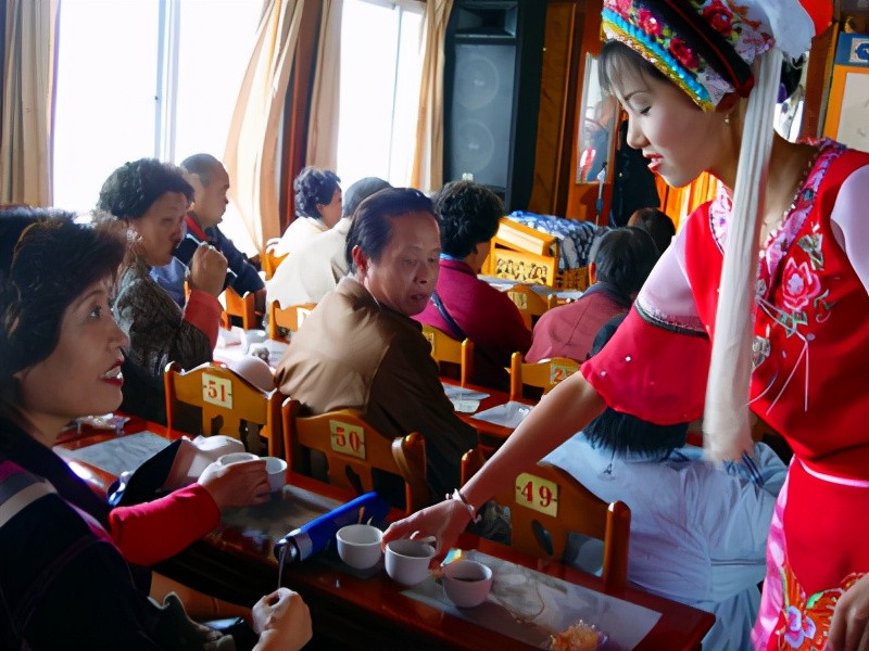 在大运号游船上,游客们在观光洱海的同时,还欣赏了由白族青年男女们表演的精彩的民族歌舞节目,并品尝了白族特有的“三道茶”。当大运号游船抵达岸畔时,船上的白族青年奏起了祥和欢快的民族乐曲为大家送行。此时已近傍晚时分,大理游的第一天也圆满结束。
