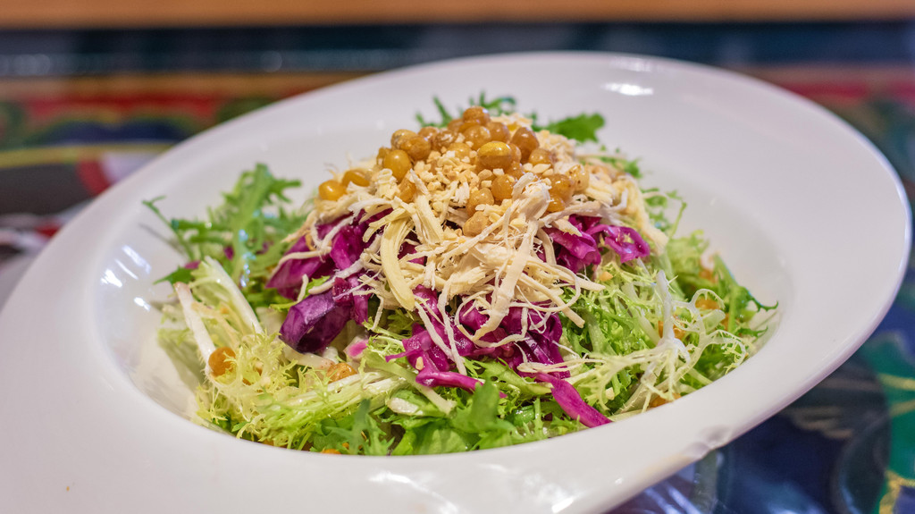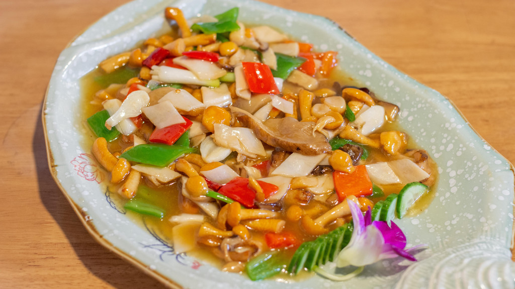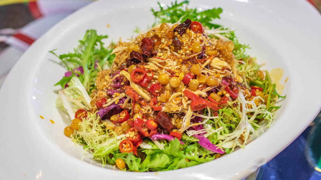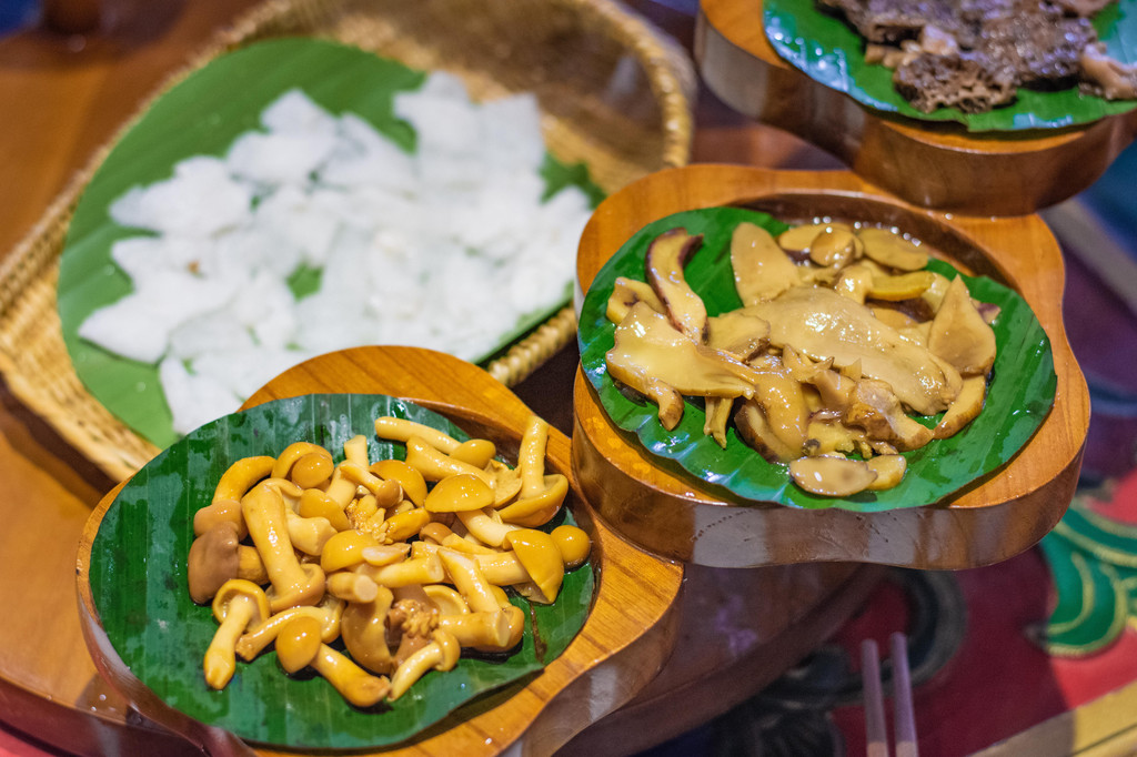 大理白族特色椒麻鸡,是以大理本地的乌骨鸡为主要原料,鸡肉小块吃起来非常方便。菜里面加了蛮多的鲜花椒,麻麻的口感很合适也非常下饭。当然,到了云南是不能不吃菌子的,苍山野生菌就很值得推荐,放心都是不会让你看到小星星的野生菌,应该也就只有正宗的云南餐厅才能烹制出这种口味佳、卖相好的野生菌了。