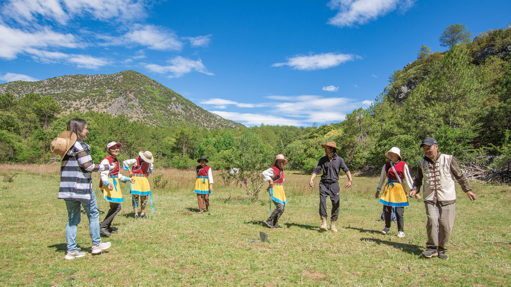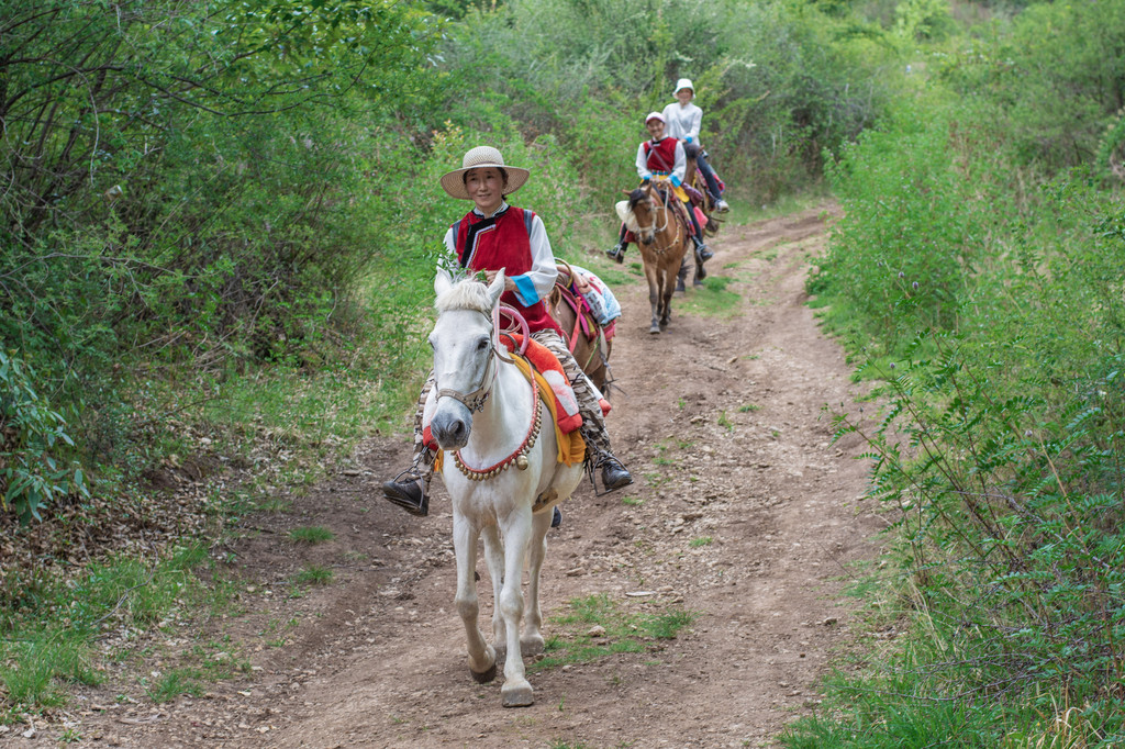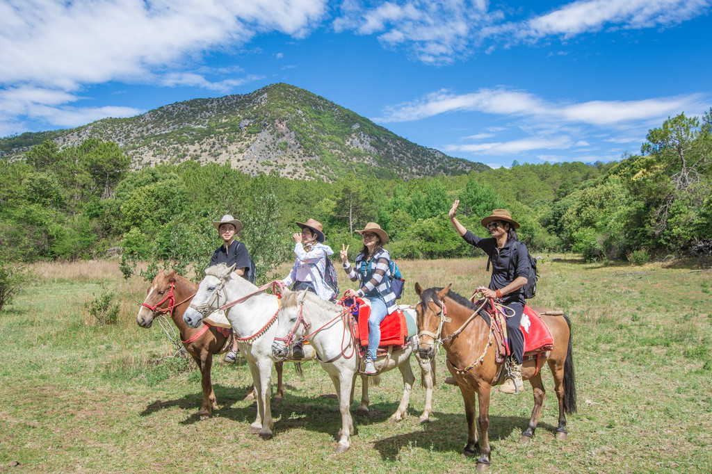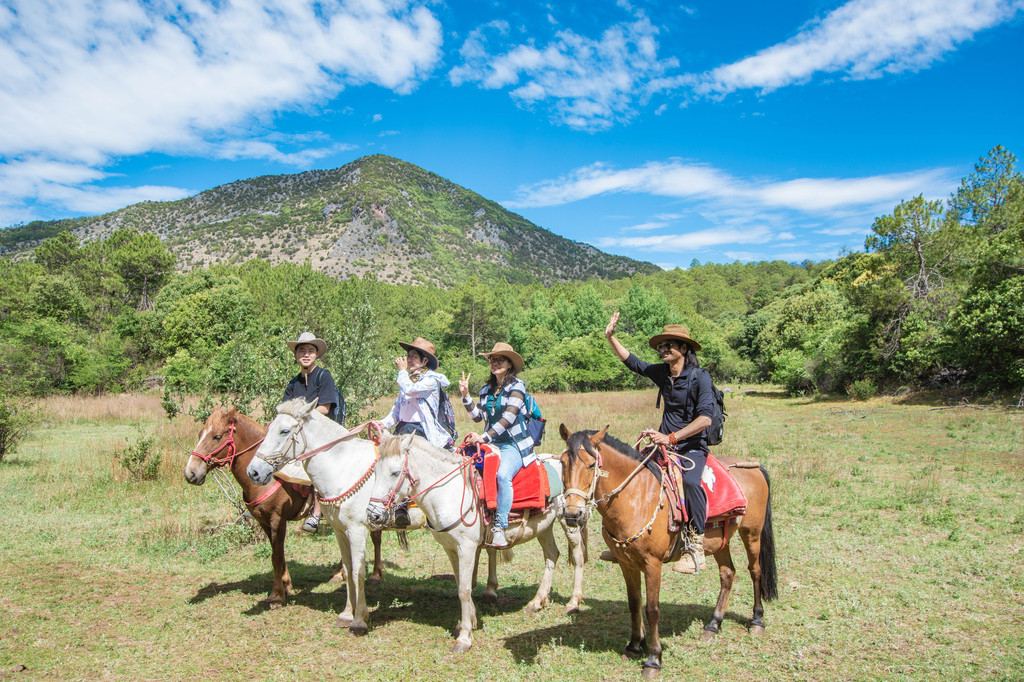 从阿若康巴出发,骑行的路程大约会花生5个小时的时间。会有专业的马队同行,他们还会带上各种专业的设备,也包括我们午餐所需要的食物和水。骑马出发,不需要太久就能离开村镇,进入山区。上坡、下坡,穿过树林,1个多小时的骑行后就能到达一片开阔的草地。我们在这里休息,一起看天空的白云,一起和同行的纳西族人舞蹈。