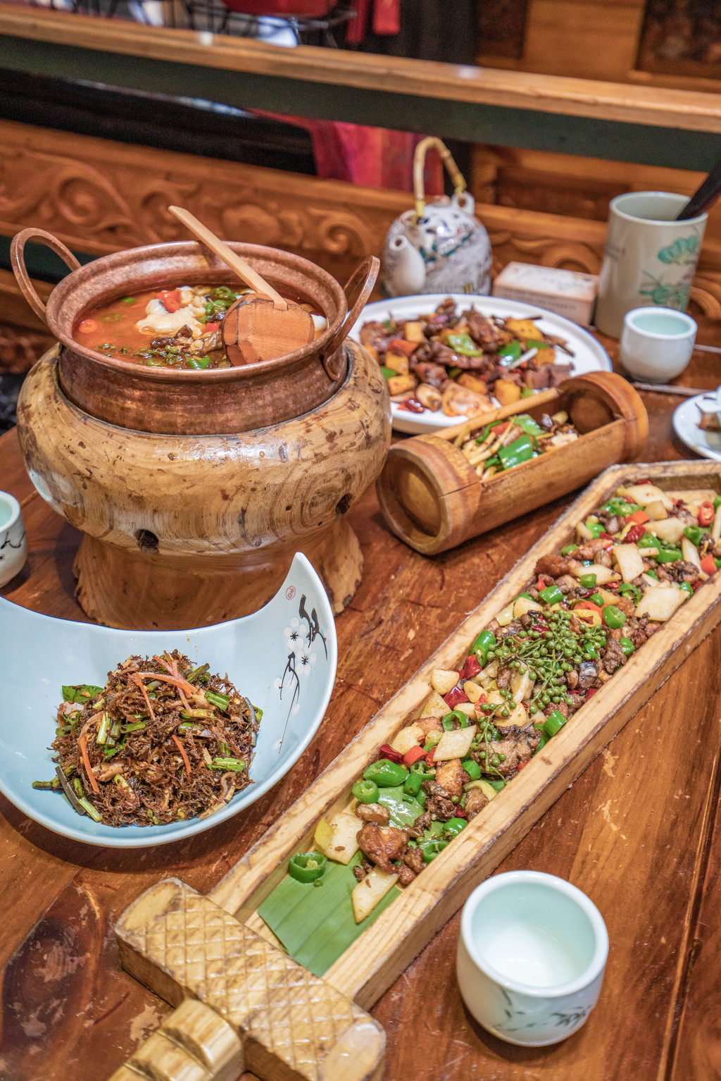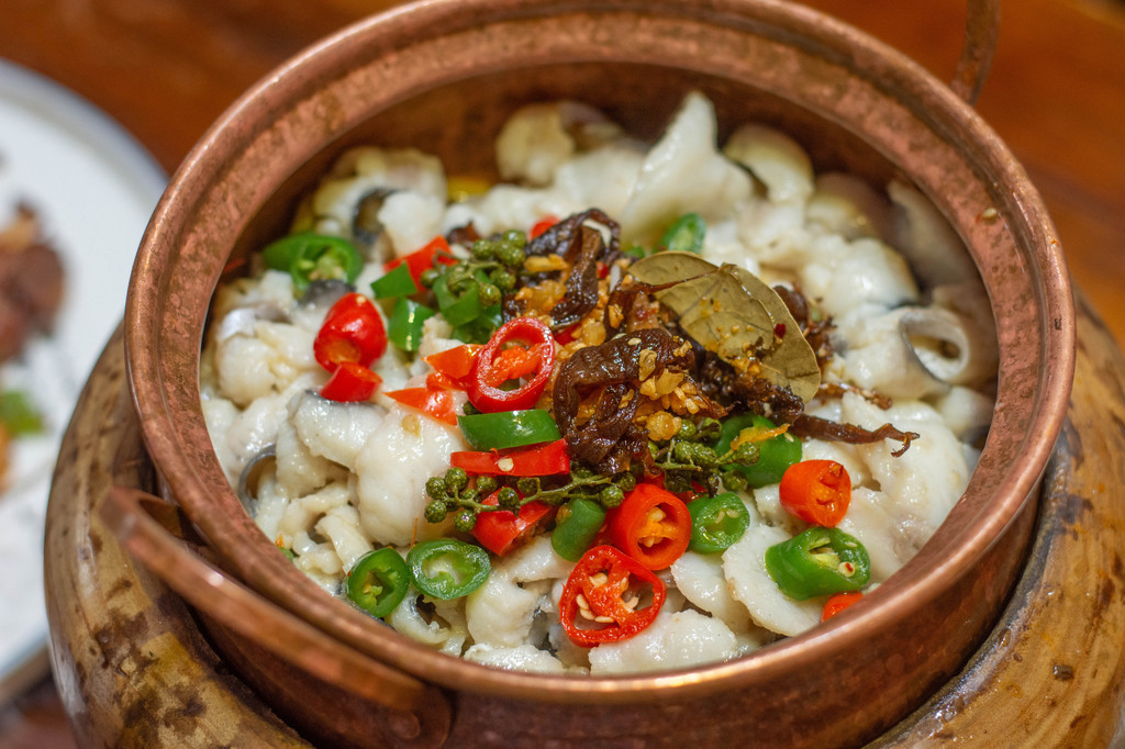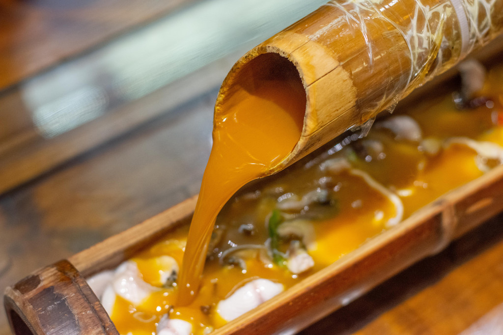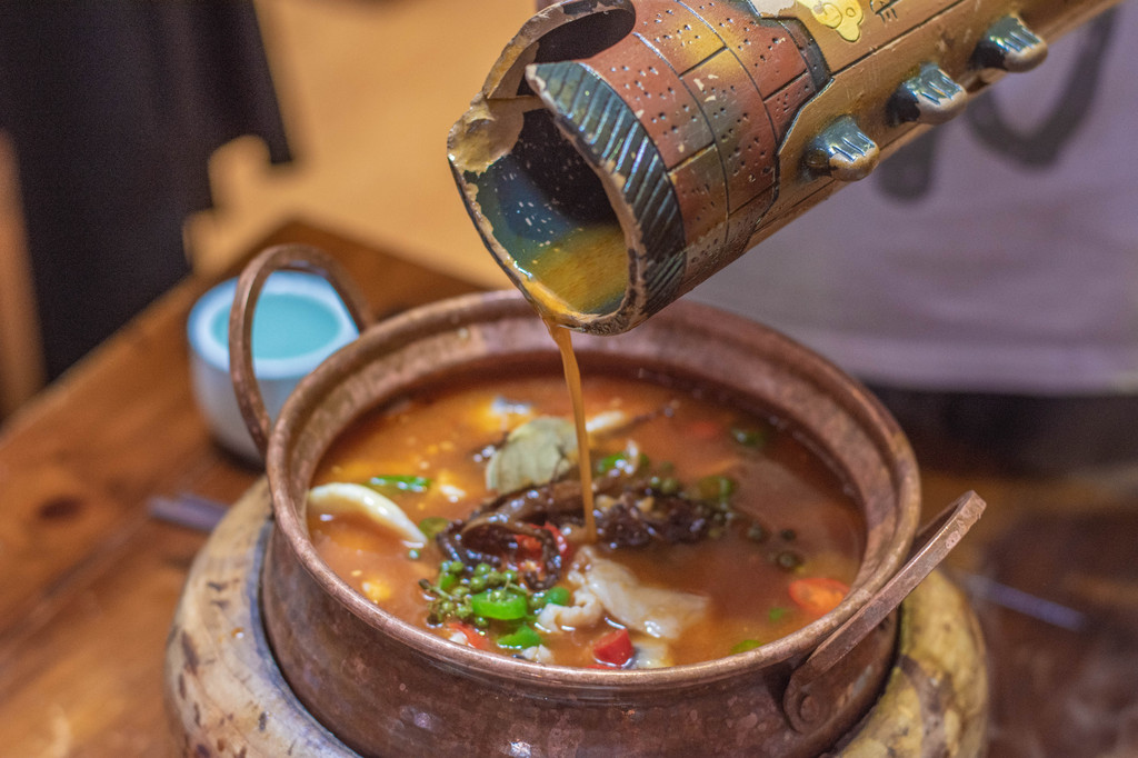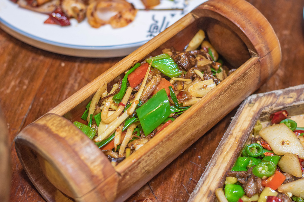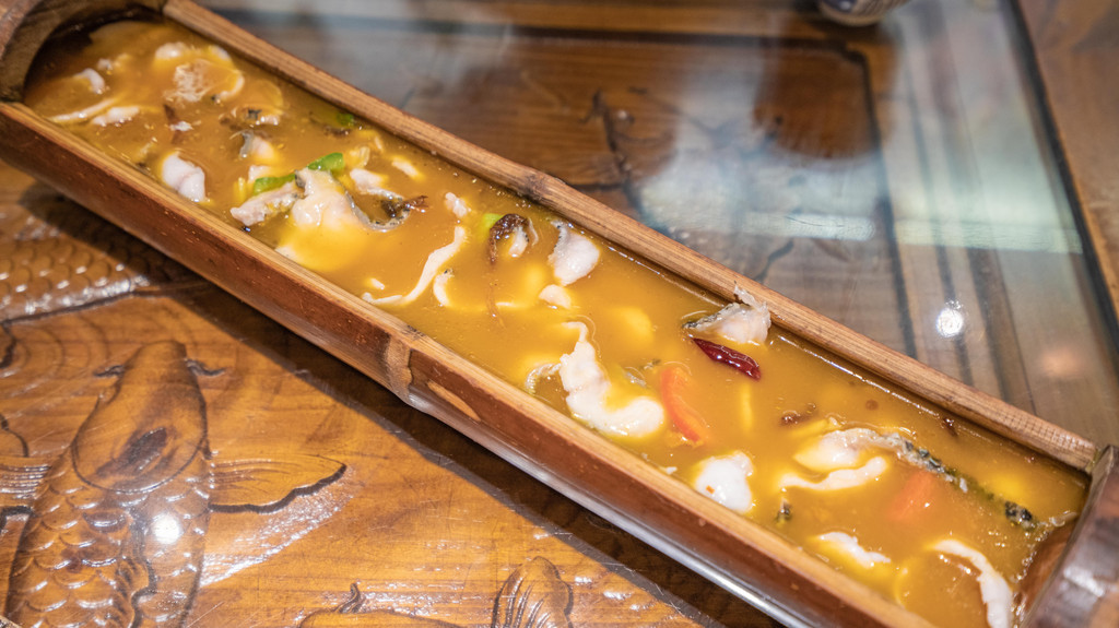 爱吃鱼的我首推的还是这家的民族竹筒雪山鱼,非常有创意的一道菜,竹筒当容器,上菜后从另一个竹筒里向鱼肉上淋酱汁。除了创意满分,鱼肉也是非常的嫩,特调的酱汁也盖住了大多数淡水鱼的土腥味,而且鱼刺也不多。