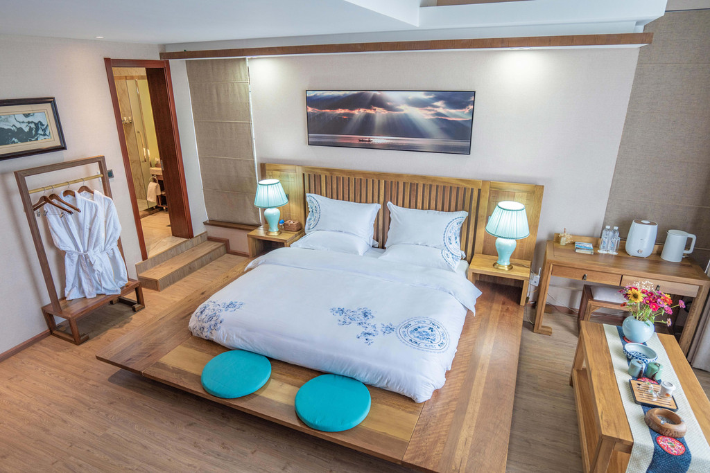 我们入住的海景大床房,有30多平的空间。而且能看到崇圣寺的三塔,也能看见不远处的洱海。客房内部装修温馨舒适,设施齐全,卫浴使用全套TOTO洁具,洗浴用品也是选用英国进口的SevenPlus套件。