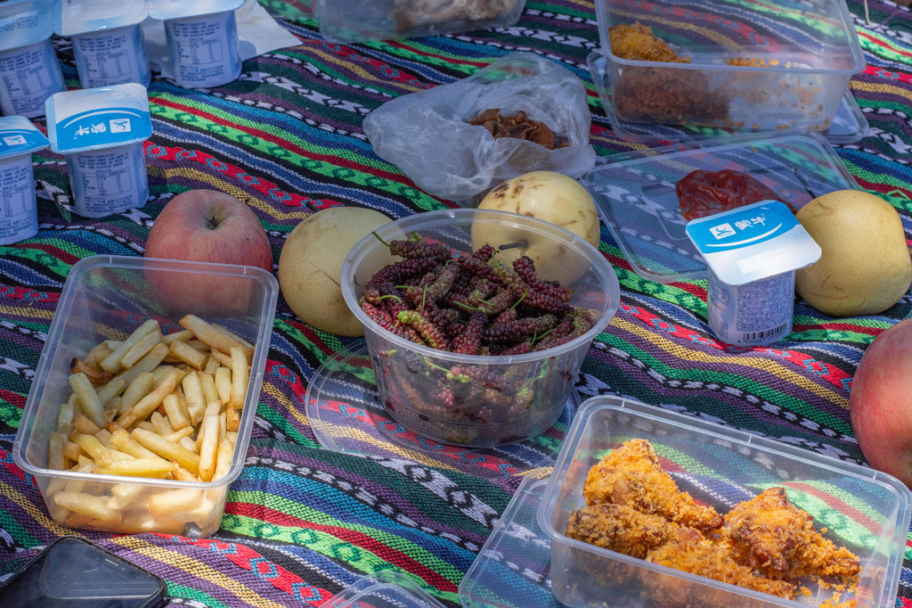 缓缓的山坡上长满青草,路旁有几栋废弃的木屋,据说这就是以前茶马古道人休息的站点。抵达这里的时候已是午后,拿出早就准备好的午餐,在一张颇具民族特色的毯子上享受今天的午餐。水果和主食,准备的种类还是很多的。