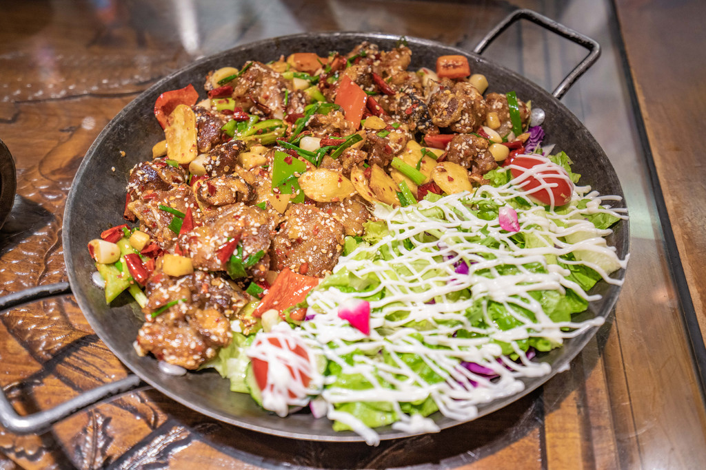 在丽江,纳西族是主要聚集的少数民族之一,所以丽江纳西排骨也一定要尝试一下。这是一道非常值得推荐的丽江本地菜,一半排骨、一半沙拉,昏素搭配非常不错,腊排骨是丽江的特色美食,这道菜的做法有点干锅的意思,非常不错。