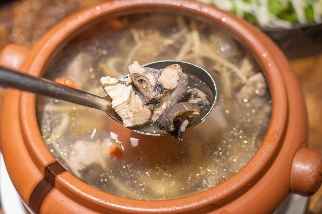 凉拌鸡丝红米面,一道很开胃的菜,微辣的口味里还带着一丝丝的甜味,很符合南方人的口味。应该是算是一道凉菜,米线很软,里面还有鸡肉,是上菜之后再由服务员淋上酱汁。土鸡养生汤,则是秋冬这个季节进补还是非常不错的。这道菜我比较喜欢的是,有搭配了至少7种不同的菌子。