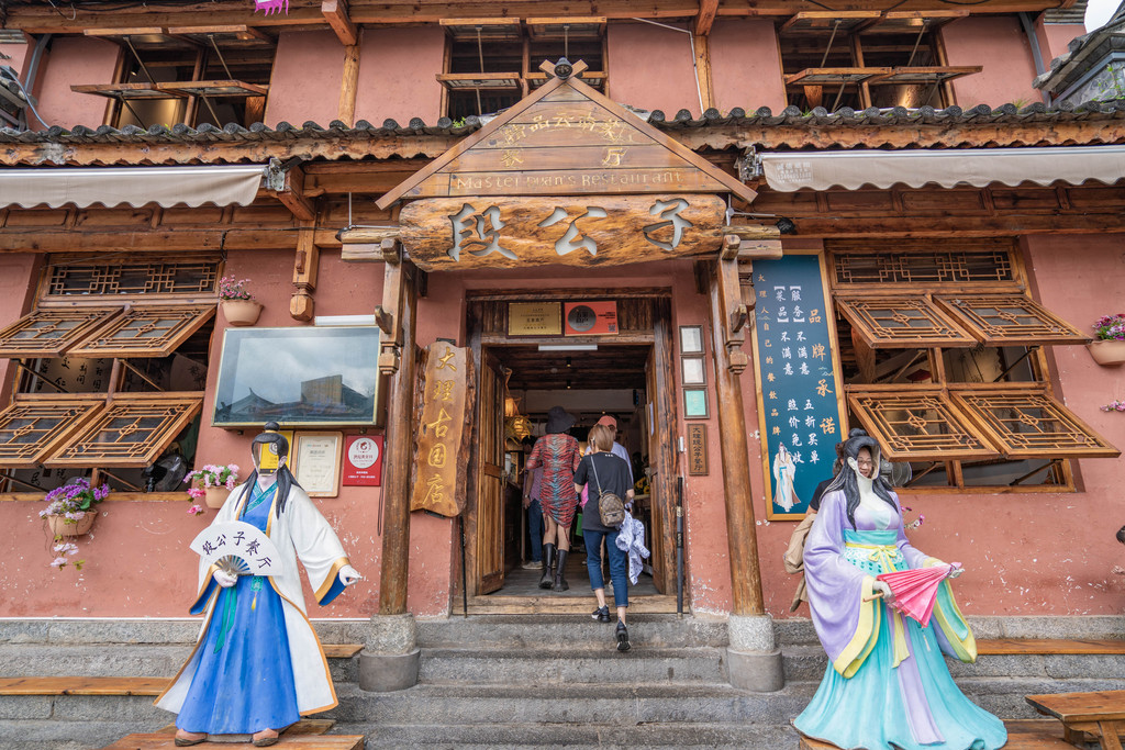 走在古城里,趴趴走累了我们第一餐选择了一家子网上评分非常高的云南菜餐厅,段公子餐厅。餐厅就在大理古城人民路上段与博爱路交叉口处(洋人街复兴路西150米,靠近南门苍山门),是装修古色古香的餐厅。比较有特色的是,一楼大厅内还放了一把龙椅,这应该是许多小朋友非常喜欢的,毕竟拍照起来还是非常不错的。餐厅内4人的长桌,多人的圆桌都有。店内的工作人员都是古装打扮,配上环境就像回到大理国时期一样。