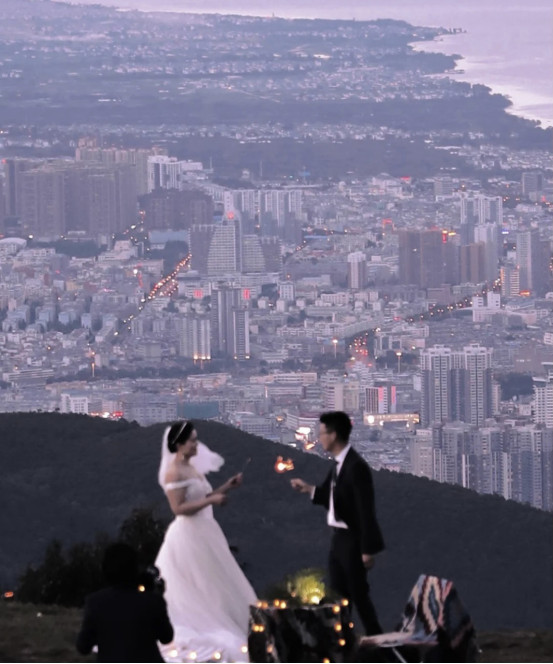 不远处穿着洁白婚纱和西服的恋人紧紧相拥,