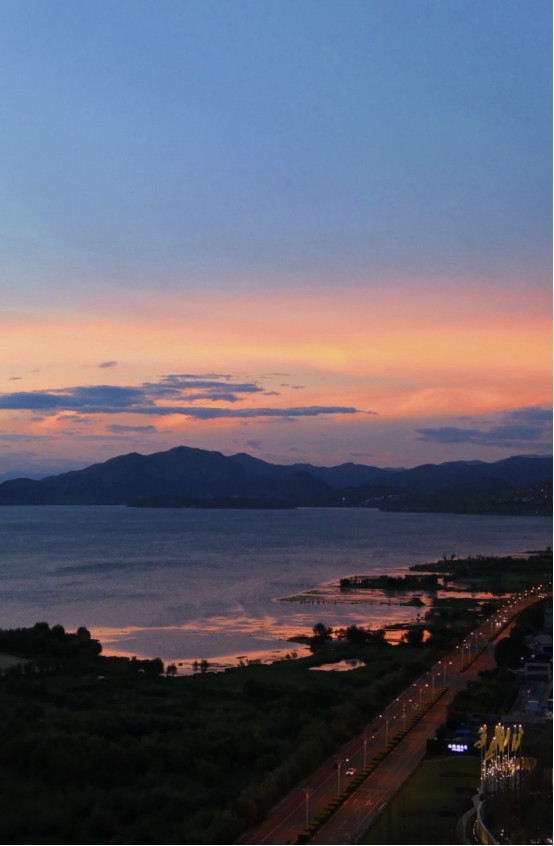 冬日黄昏时,大理的西洱河两岸城区中,