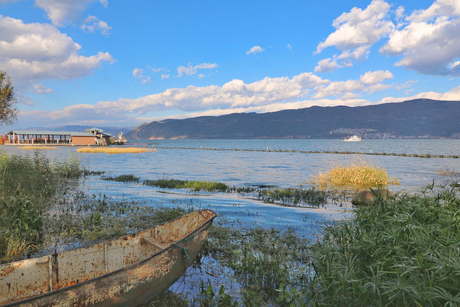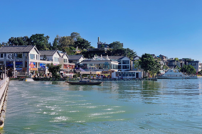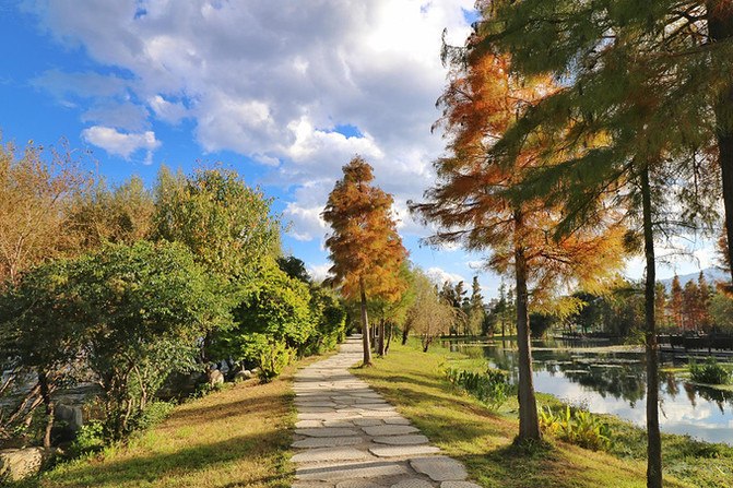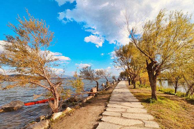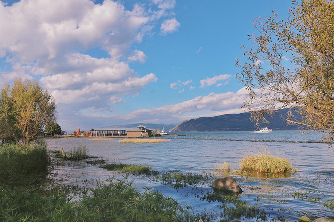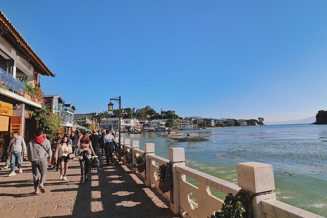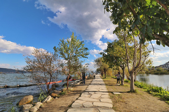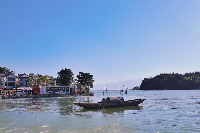 从古城出发,往才村方向走,一路是田野,是耕作的白族阿娘。沿着月华路一路向东,抵达才村码头。可以租上一辆电动车骑行,游览洱海的风光。
