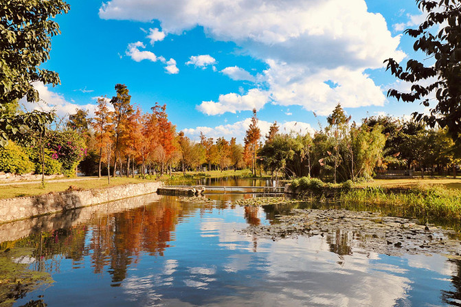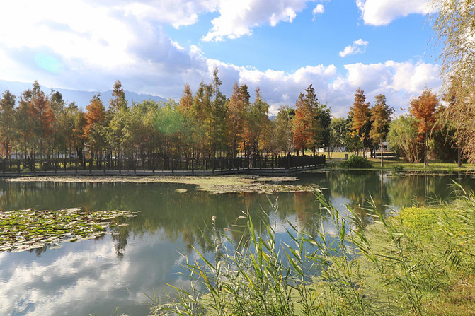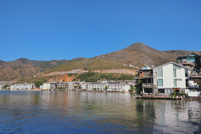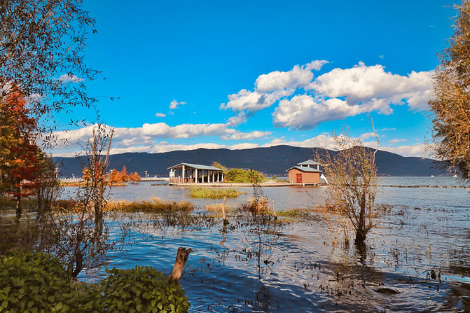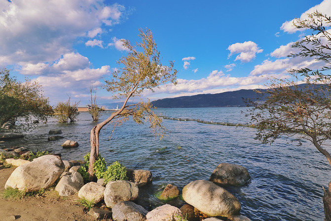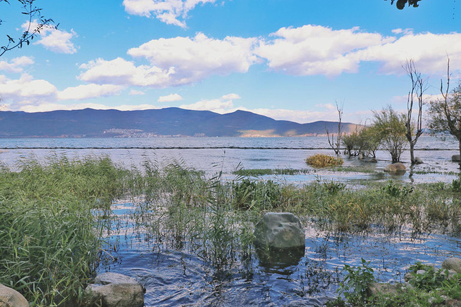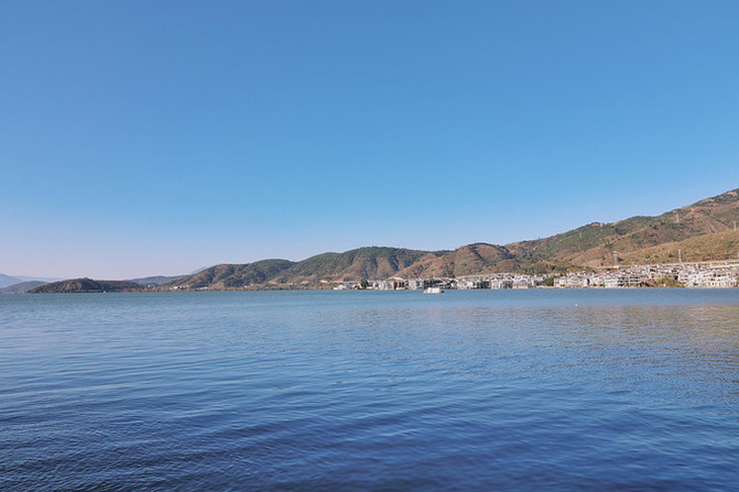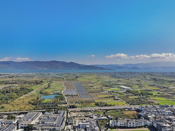 从空中往下看,洱海没台风没有龙卷风,偶尔点小风小浪,但洱海依然很温柔,宛如新月,静静依卧在苍山和大理坝子之间。高低不平的波浪,有秩序地往前走,树儿的倒影在水面浮着,水小禽停歇着,再加上万缕阳光投射下来,形成美丽的山水画,怎么不让人留恋呢?