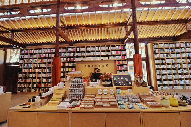 书店在一个非常不起眼的村庄里,被田野包围着,书店里的书籍选品都非常有在地文化的特色。同时,与当地文化结合所创造的文创产品是书店里最大看点,甲马、瓦猫、扎染等文创产品,做工和出品都很赞。