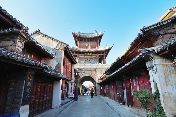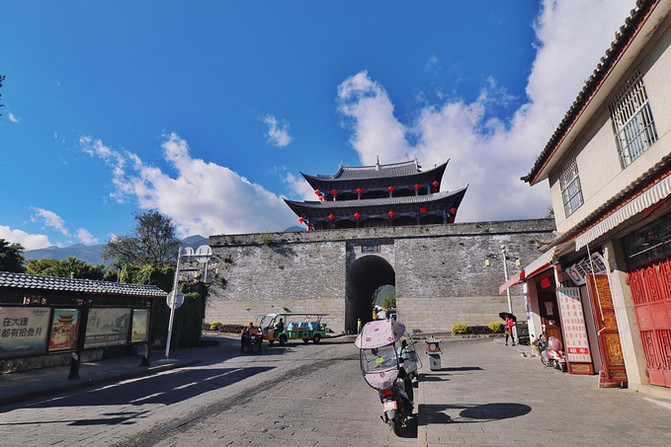横穿拱辰楼城楼,各色商厦、餐厅、茶馆林立,居民住宅大部分至今仍保持明清风格。整座古城保存较为完整,有瓦顶木、砖墙两层古建筑特色与风貌。老城里人悠闲地生活着。