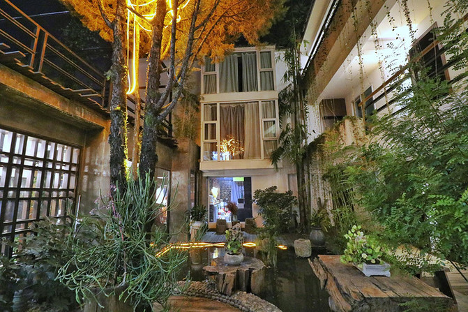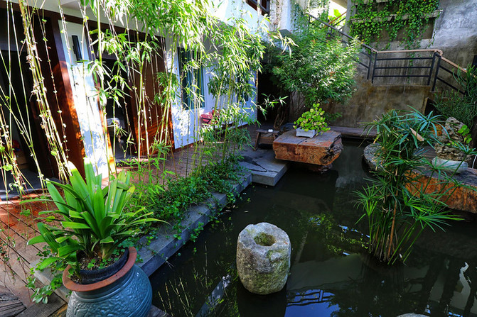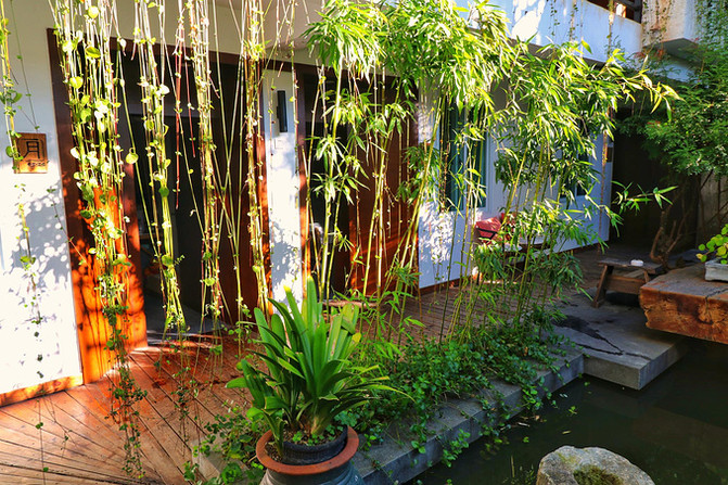 进到民宿里,到处是古色古香的。一楼有一个中式庭院,院中有一颗非常高大树,可以看得出店家很用心的打理,各种装饰,各种花草树木,非常有森系的感觉。