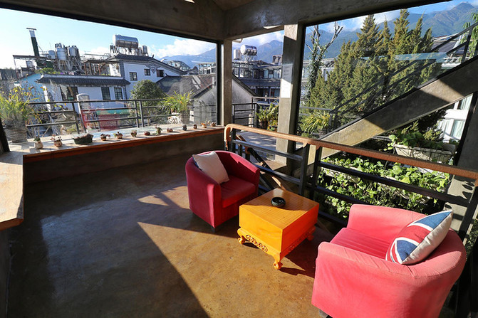 走廊上从屋檐垂落下的绿植,二楼三楼是客房,公区还有摆放了沙发,二楼还有一个露台,这里可以晒晒太阳,慵懒的度过下午时光。这里的大理等着你牌匾,也可以拍出很漂亮的照片哦。