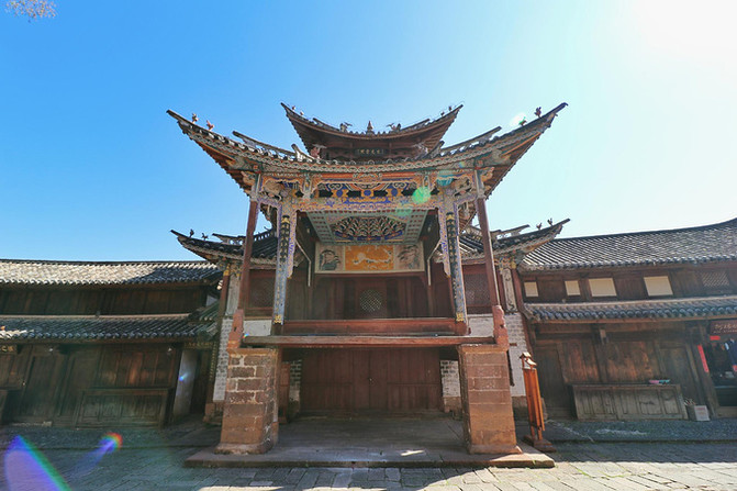 古戏台是寺登四方街上最具特色的古建筑,每逢民族节日,沙溪白族儿女各自身着节日盛装,弹着龙头三弦,齐聚四方街,在戏台上载歌载舞。
