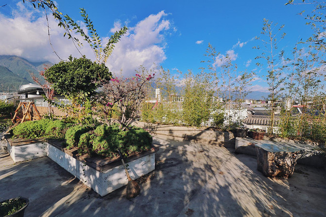 从这里可以走上天台,楼顶种满了植被,在民宿里就像走进了大自然。到处都充满了清新自然感。花草树木,蓝天白云,安静闲适,住在这里真的是太惬意了。
