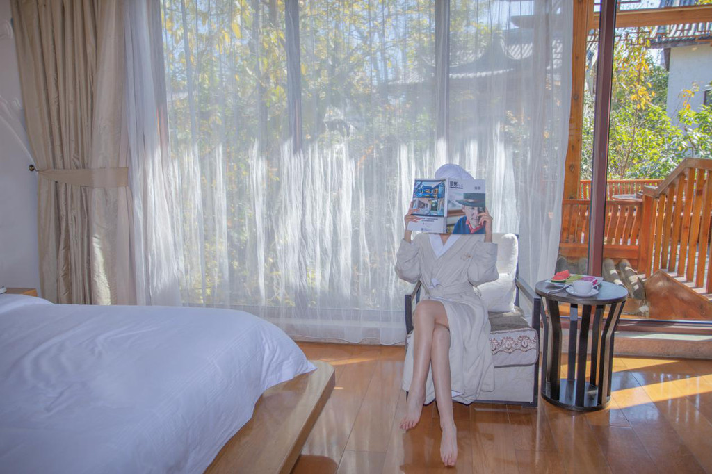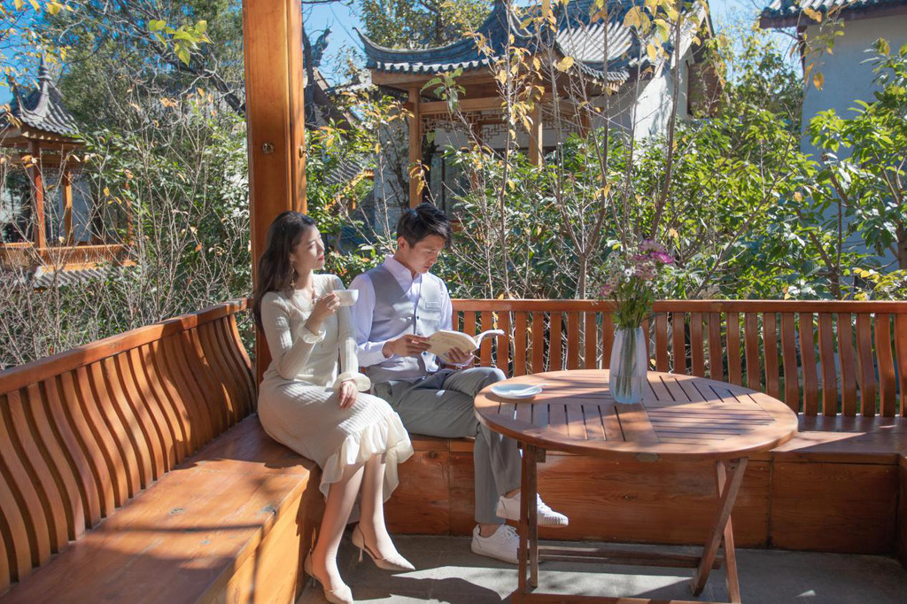 我们住的是苍山园·私密亭园大床房,宽敞的落地窗能让我俩躺在床上也能一览室外的庭院美景。和房间相连着的,是一个采用木料制成的小亭子,里面还有一张小桌子,我和老公在那里品品茶,看看美景,生活本该如此放松!