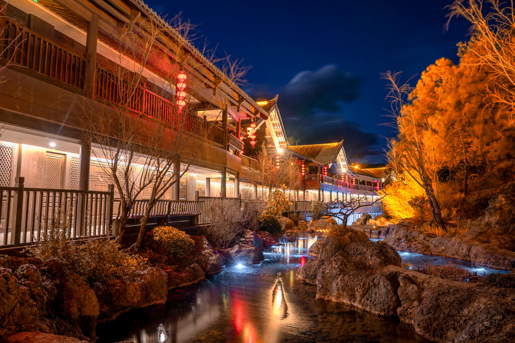 酒店结合中国风元素和纳西族特色,精心设计的中式园林景观,庭院流水,木屋青瓦,像一幅画卷。