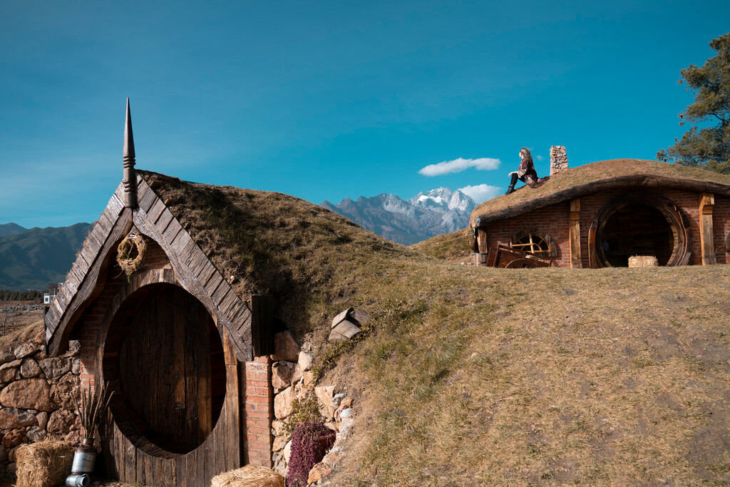 一共有三间霍比特人小屋,布景很用心,每间都好拍,左边这间的斜坡、上面那间的屋顶都可以拍到雪山为背景的照片,小屋附近还有很多道具可以拿来拍照。