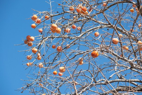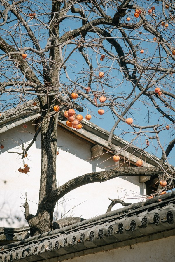 橙黄色的柿子挂在光溜溜的枝头,在阳光的照耀下,一个个好像散发着金光,耀眼极了,治愈了这萧瑟的冬日。