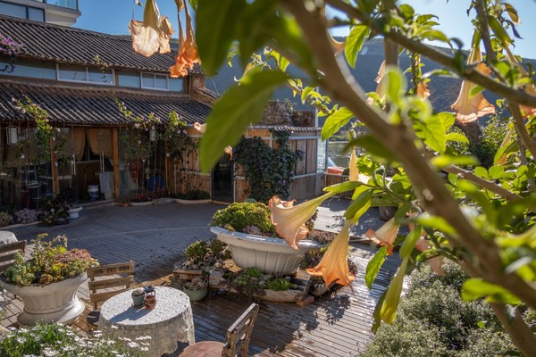 白族特色的屋顶建筑,纯白的外观,质朴而简洁。进入民宿内,百花竞放、绿意盎然,墙头也爬满了绿叶,间或掺杂着紫红色的小花,好似给美丽的房子穿上了一件更为绚丽的衣衫。这幢被绿意包围的房子,想象住在这充满生机的房间里,鼻尖常若有若无地萦绕着袅袅清香,让人好梦正酣。第二天醒来,伸个懒腰,立刻精神百倍,浑身上下都充满活力。