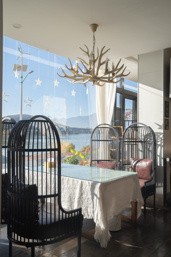 早餐也很精致好吃,可自选。一楼的用餐环境直接就能看到洱海的景色,别具一格的鸟笼座椅和鹿角灯,可窥见民宿设计的用心。
