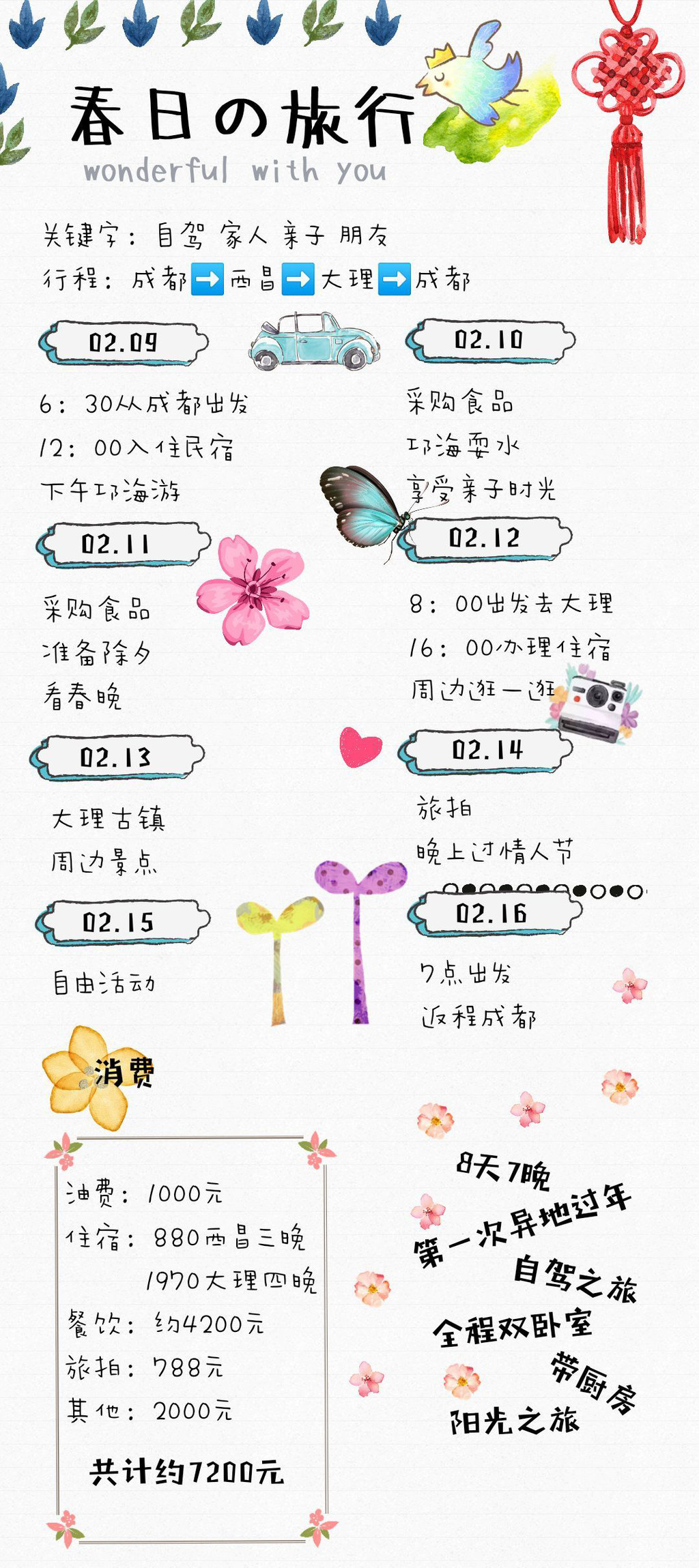 2月9日(大年二十八)成都→西昌2月12日(大年初一)→大理→(丽江→大理)2月15日→成都2月16日