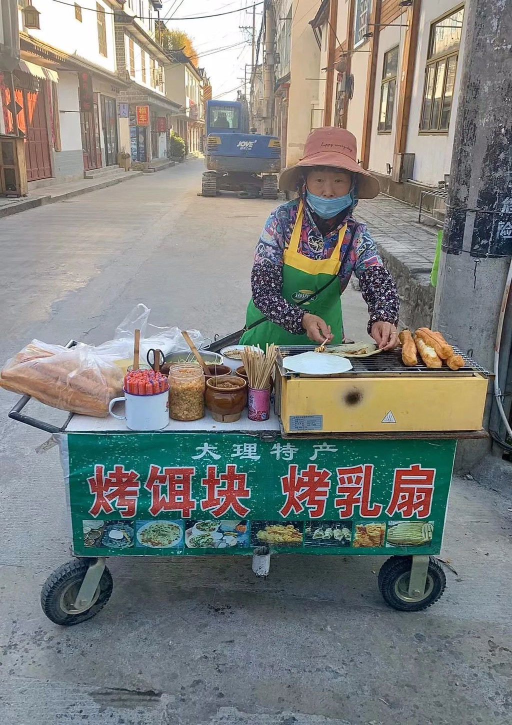 阳光大,女农民我戴上麋鹿星球买的那顶日本春游帽。大理人教我背对太阳晒,这里海拔高,只要是背光的就凉爽舒服,暴晒容易灼伤皮肤。破天荒一顿吃完玫瑰糖烤乳扇和烧饵块。