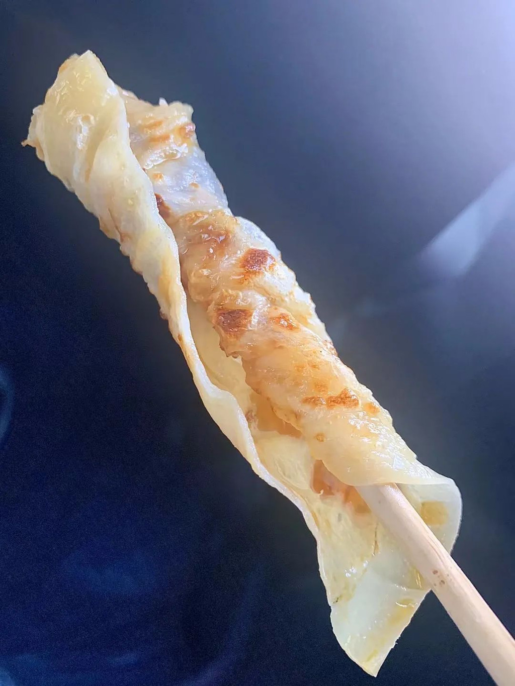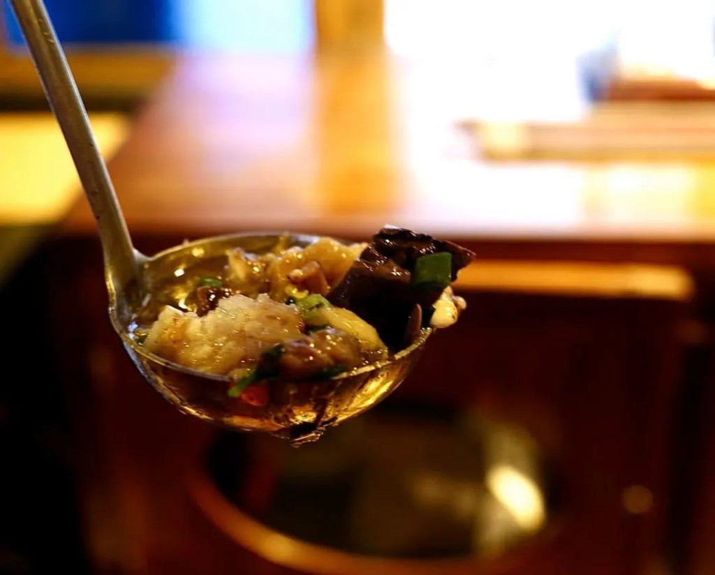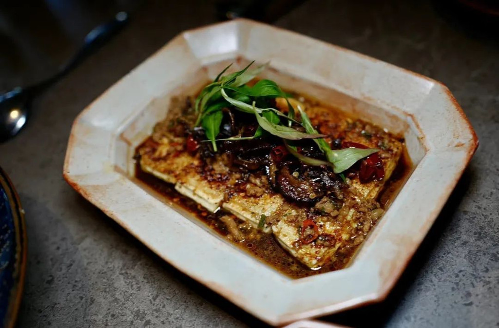 包浆豆腐上撒了鸡纵油,豆腐孔里全是鲜的。