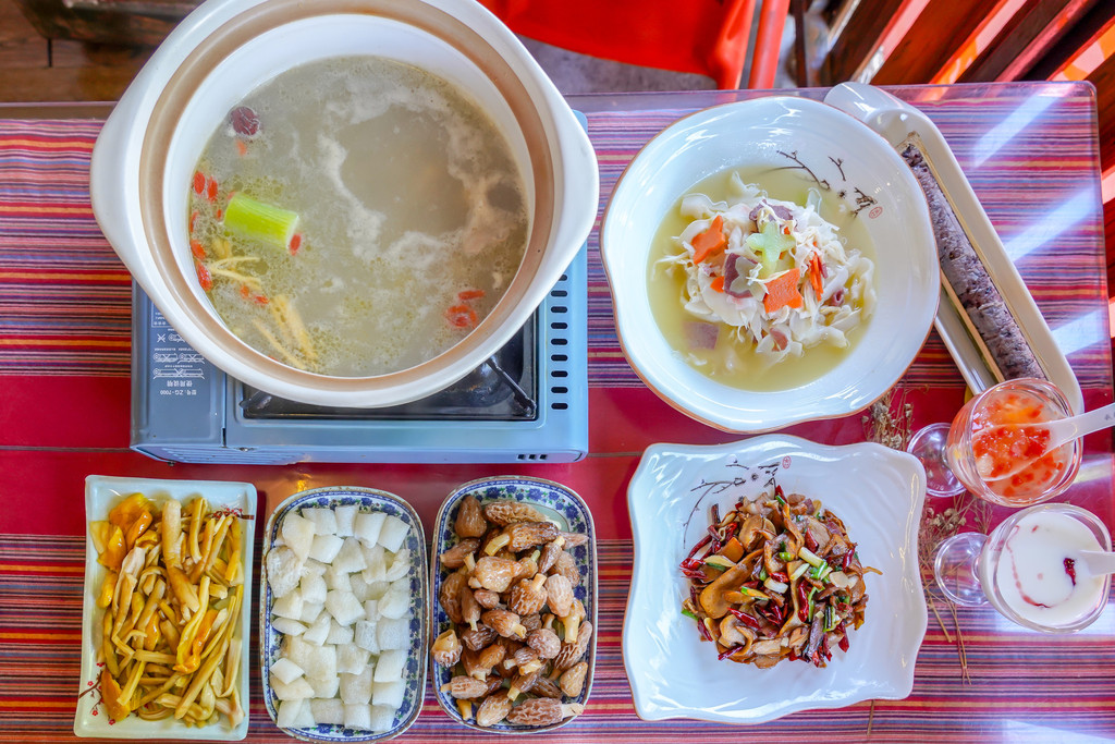锅底煮开后,服务员会把菌子全部倒入锅中,然后放一个沙漏计时,沙漏漏完后就可以吃啦,最让我惊喜的是,竟然还免费在汤里加了藏红花,而且汤里的鸡肉也是免费加的哦,老板真是太实在了,难怪人气和口碑都这么高。